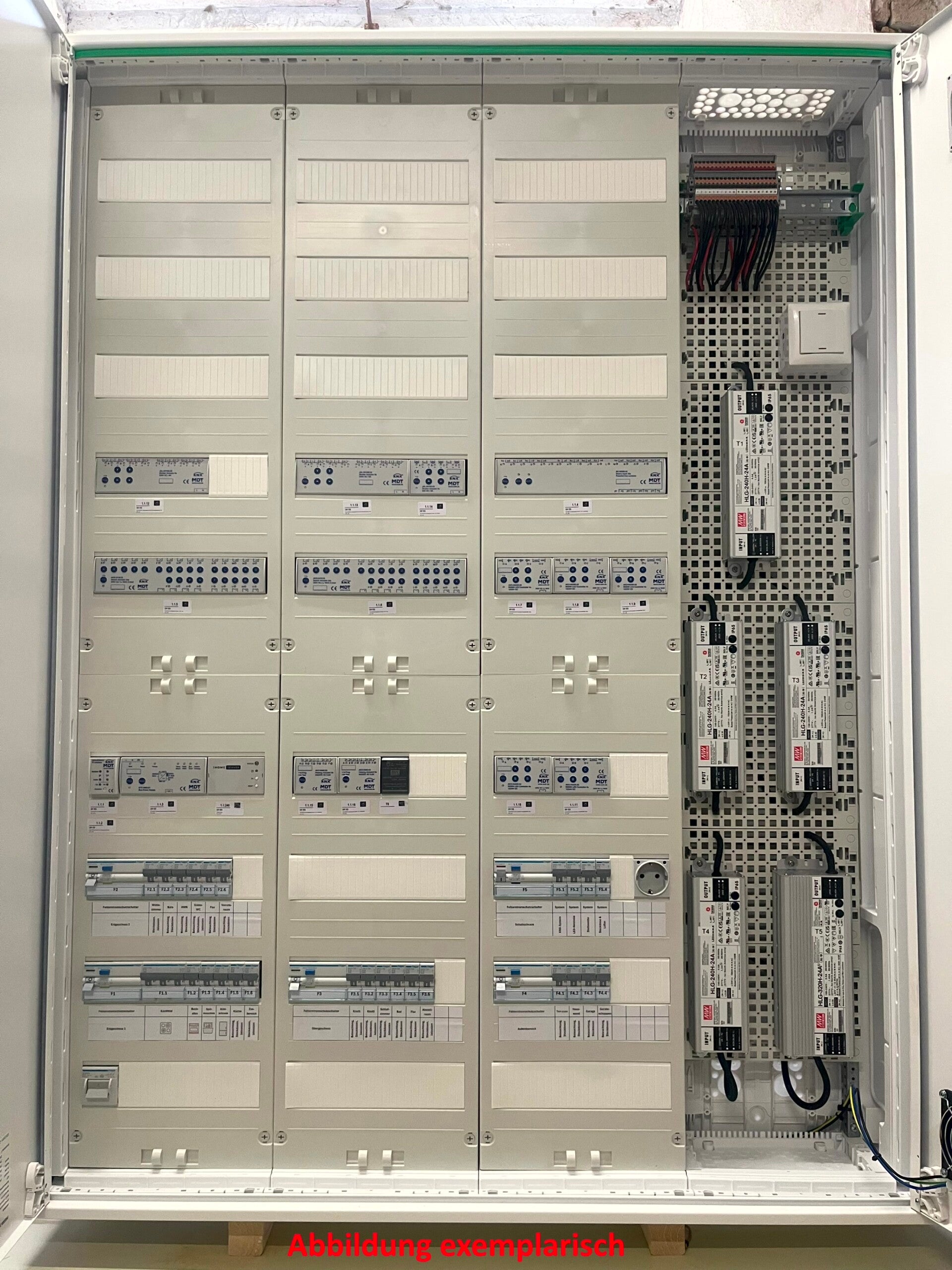 1x komplett verdrahteter Schaltschrank mit KNX-Komponenten, FI und Leitungsschutzschaltern (1 LSS pro Raum plus E-Herd, Backofen & Spülmaschine) Alle Leitungen sind auf Reihenklemmen aufgelegt und die bauseitige Installation muss nur noch aufgelegt werden.